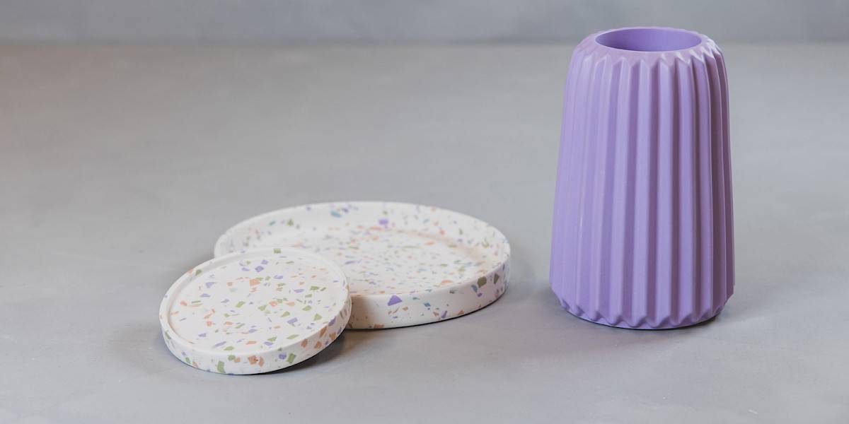 Dit kleine dienblad is uit kunststof gemaakt. De terrazzo zorgt steeds voor een andere uitkomst.